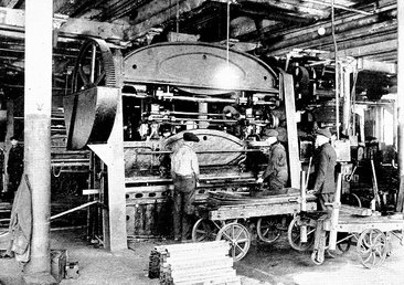 Another large press at work on the forming of steel shapes for the interior framing of the cars
