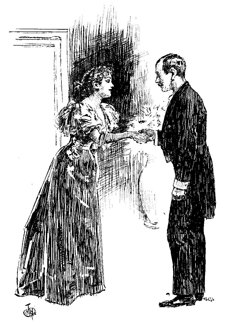 Undershell (in the dressing-room, to himself). I wonder how long I've been locked up here—it seems hours! I almost hope they've forgotten me altogether.... Someone has come in.... If it should be Sir Rupert!! Great Heavens, what a situation to be found in by one's host!... Perhaps it's only that fellow Spurrell; if so, there's a chance. (The door is unlocked by Tredwell, who has lighted the candles on the dressing-table.) It's the butler again. Well, I shall soon know the worst! (He steps out, blinking, with as much dignity as possible.) Perhaps you will kindly inform me why I have been subjected to this indignity?