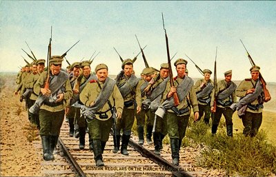 The Russian infantry is famous for close fighting with the bayonet, which is made a part of the gun and cannot be removed. The faces of the men are a distinctively Slavic type. They are patient, enduring, brave, and fight with a stubborn tenacity which has wrecked the hopes of every general in history who attempted the invasion and conquest of their territory.