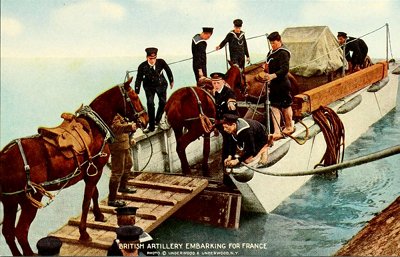 This is one of the barges used to carry horses and guns to the transport ship. The horses are then lifted into the vessel by means of a belt around their bellies. Some of the jackies have taken off their shoes and stockings and rolled up their trousers. The artilleryman, partly hidden behind his mount, is dressed in khaki.