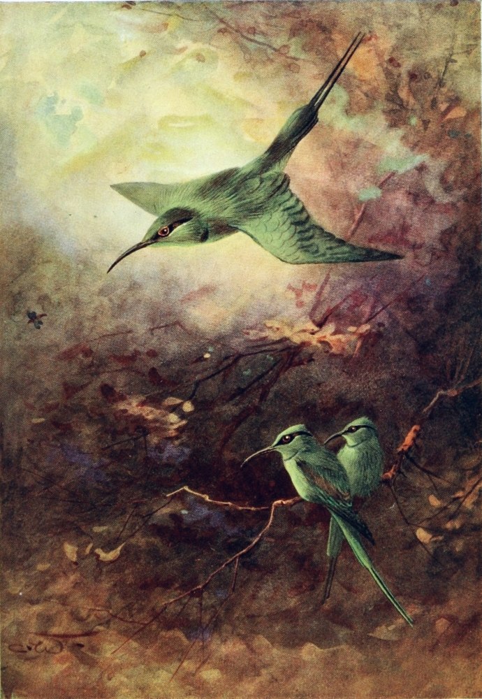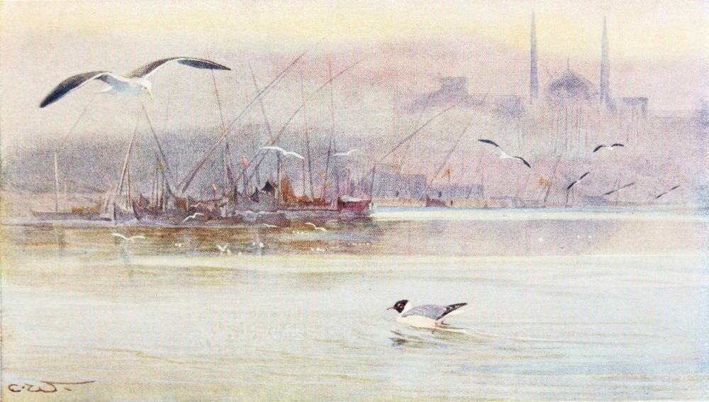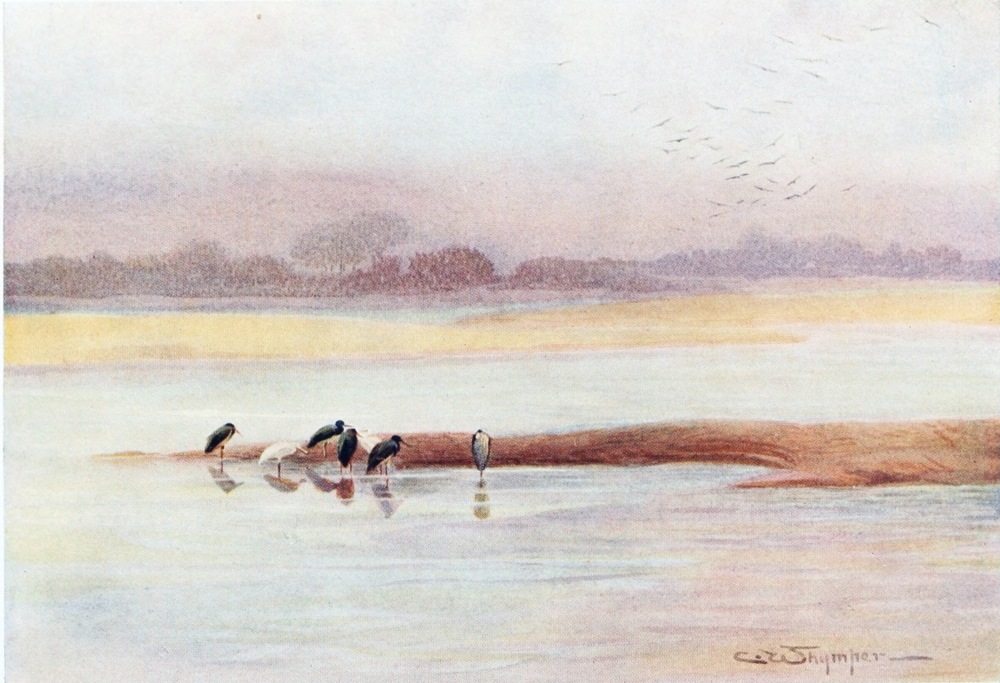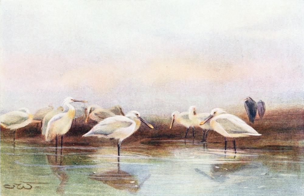 The Griffon Vulture, The Egyptian Vulture, The Kestrel, The Parasitic Kite or Egyptian Kite, White Owl, Screech Owl, The Little Owl, Egyptian Eagle Owl, The Hoopoe, The Kingfisher, Black and White Kingfisher, The Little Green Bee-eater, The Swallows, White Wagtail, The Crested Lark, The White-rumped Chat, Rosy-vented Chat, The Blue-throated Warbler, The Reed Warbler, The Sparrow, The Desert Bullfinch or Trumpeter Finch, Hooded Crow, Egyptian Turtle-dove or Palm Dove, Senegal Sand-grouse, Sand Partridge, The Quail, Cream-coloured Courser, The Green Plover or Lapwing, Spur-winged Plover, Black-headed Plover, Little Ringed-plover, The Snipe, The Woodcock, The Painted Snipe, The Avocet, The Sacred Ibis, The Crane, The Spoonbill, The Storks, The White Stork, The Black Stork, The Shoebill or Whale-headed Stork, The Common Heron, Buff-backed Heron, The Night Heron, The Flamingo, Green-backed Gallinule, The Coot, The Egyptian Goose, Pintail-duck, The Shoveller Duck, The Teal, The White Pelican, The Cormorant, Lesser Black-backed Gull, The Black-headed Gull.