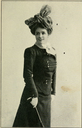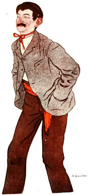 The Parisian revue is in structure traditionally ever the same, and the receipt for these musical puddings is never altered. There are two important characters which are never to be departed from—the commère and the compère. The first fifteen minutes are occupied with the introduction of a young man of leisure, the compère, who has just inherited a colossal fortune from a dying uncle. He brings with him an exaggerated outfit of clothes, all brand new, consisting of a sack suit of dove gray, lined with red satin; a voluminous red satin tie to match the suit, clasped with a heavy turquoise-studded ring; a gold-buttoned embroidered vest; a soft gray felt traveling hat; lemon kid gloves, and a rattan cane. He stalks about the stage, smiling—the stage picture of good health—and squaring his shoulders and curling the ends of his long mustache with that debonair air supposed to be consistent with good luck. His ecstasy over what fortune has bestowed upon him would put in the shade even the enthusiasm of the “found at last!” gentlemen of the Eureka advertisements.