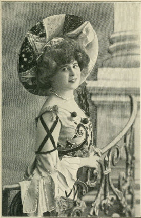 Before he gets half way down the village street of the first act, the commère, a statuesque fairy queen in silk tights, with real gems that are the talk of Paris, who has been hunting for him all over the town, suddenly comes upon him in the village square, and, touching him with her wand, makes him her protégé.