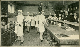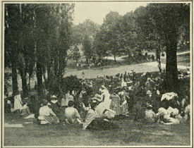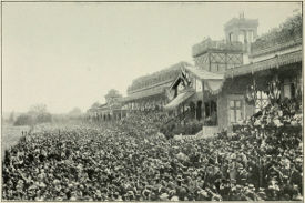 Only the two chefs hired from Paris seemed placid. They stirred their sauces, poked up their fires, and then leaned out of their kitchen window as coolly as an engineer and fireman waiting for orders to go ahead. It was noon. The crowd along the terrace was cheering. The rowers had arrived—a score of spindle-legged youths with their overcoats thrown over their shoulders to protect them from the chill wind. Bleak clouds hung heavily in the northwest. Suddenly came a blinding flash of lightning, the thunder boomed, and down came the rain.