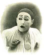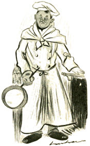 You will hear Polin at the Alcazar. He comes on at the end of a preliminary program of excellent variety before the revue. Fat jolly old Polin, whose song creations portray the happy-go-lucky lot of the common soldier. He reels in from the wings, convulsed with laughter over some recent adventure, the result of which has put him in the guard-house for ten days. He is fairly bursting his red-trousered uniform with merriment as he begins his first verse. He tells you every detail of his experience, painfully even, for he is now crying with laughter, his voice rising in little squeaks like the water in a pump and bubbling over as he reaches the point. He is manipulating the while a red cotton handkerchief, which is never still; now it mops his round genial face, now it is twisted nervously into a rope and jammed into his trousers’ pocket, and as speedily taken out to dust his knees. His last verse is smothered in chuckling glee; little jets of cleverly chosen words manage, however, to get over the footlights to his listeners. The song ends amid a thunder of applause and Polin bows awkwardly and retreats with his back to the audience, his cavalry boots combined with his red trousers flopping as he goes.