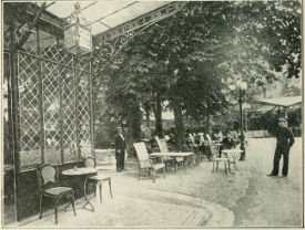 If you wish to buy your tickets in advance for the evening performance at the Alcazar d’Été, the open-air café concert of the Champs-Élysées, you go there some afternoon, and are ushered by a waiter through a narrow corridor of the adjoining restaurant, past little rooms, shining in copper pots and pans, and pungent with steaming sauces, through a pair of swinging doors well worn by hurrying waiters, and into a square room piled high with snow-white linen, pyramids of lump sugar, and rows of glittering silver. Half hidden in a corner among this spotless collection you discover a desk presided over by madame, who greets you pleasantly and produces for your inspection from beneath a litter of dinner checks and bills the seating diagram of the Alcazar.