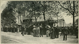 A long line of carriages is ascending the Champs-Élysées. Here and there among them you will see the glitter of smart turnouts. In the cool Bois nearby, the deer from their noon-day hiding-places hear the trot of equestrians passing in the feathery alleys. Upon some grassy corner of the wood a family party have spread themselves and laid out their bread, cheese and wine for a day’s outing. Like a yellow pearl shimmering far up in the azure, a balloon sails briskly toward Vincennes.