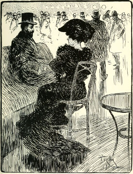 It is the first night of the new revue. This well-fed old baron! His beard is grizzled now and his bald pate shines beneath the rim of his stove-pipe hat. How many revues has he seen in his Parisian life! How many capricious débutantes of café concerts and the theater has he known! How many has he seen flash into brilliant stars and then grow old and fade away! Some of them are staid old concierges now knitting away the short remnant of their lives. Some of them died young as roses will under gas-light. Les petites femmes! Ah! the good old days of the Palais Royal! The Orangerie! or the Tuileries and the Jardin Mabille! The days of brocades, of cashmeres, and pendent jewelry of malachite and old mine diamonds! What famous beauties then! and how they could wear their flounces and furbelows—the little minxes! What a reckless riot of costly gaiety! How much baccarat at the clubs! How many suppers at Bignon’s and the Maison Dorée! How many years of all this! and yet on this sunny afternoon this old baron is as eager as a schoolboy over the new burlesque, and so he strolls out with his ticket up the Champs-Élysées, stopping for a full half hour to watch the Guignol and the children and the nurses. Later you will see him rolling through the Bois in his victoria, a queenly woman in black by his side, the tea-rose stuck jauntily under the turquoise collar of a sleek red spaniel in her lap. The baron is smoking. There is no conversation.