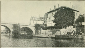 There was a fête at Limay. The only hotel in this apology for a town was shaken by the trampling feet of dancing swains when I arrived. They informed me that the ball would continue all night and the next day. Inside the ballroom the town band pumped away amid the discordant shrieking of two cheap clarinets, the drone of a mournful baritone horn, and the thump of a bass drum. The effort was anything but conducive to sleep. I crossed the bridge and entered Mantes, a splendidly built old city with a rare Gothic cathedral.