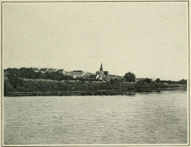 The character of the people becomes more primitive. I row on past La Frette, a red-and-white town snug against a hillside checkered with vineyards. At evening I reach Herblay, and a quaint inn with a tiled kitchen shining in polished copper. The town is very small, very crooked and very old. Boat-loads of peasants, many of them in coats of sheepskins, returned at evening from their work in the fields.