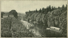 A little below all this I carry over a narrow bit of land to avoid the lock at Bougival. Here the Seine resembles somewhat the Thames. Fine estates with formal gardens run to the edge of the river. Cedar boats gay in colored cushions and silk parasols are drawn under shady trees, the nooks of idling house parties. From the walls of one country place the butler is fishing in his spare half hour before dinner. The gateway to this estate is protected by an iron grille bearing in gilt the crest of the family. A smart coupé passes, driven by a cockaded coachman.