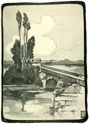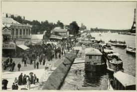 Under a vault of turquoise sky the Alexander Bridge, emblazoned with its golden horses, spans the Seine, crowded with traffic sweeping beneath the great arc. Sturdy steam-tugs with vermilion funnels tow long sausage-like lines of newly varnished canal-boats, whose sunburned captains with their sweethearts or families lounge at déjeuner under improvised awnings stretched from the roofs of cabins shining in fresh paint. Down the great vista of the Seine each successive bridge is choked with thousands of hurrying ant-like humanity. Swift bateaux-mouches dart back and forth to their floating stations. For a few sous these small steamers will take you to St. Cloud or beyond, past feathery green islands, past small rural cafés perched upon grassy banks where all day long old gentlemen wearing white socks and Panama hats wait patiently for a stray nibble.