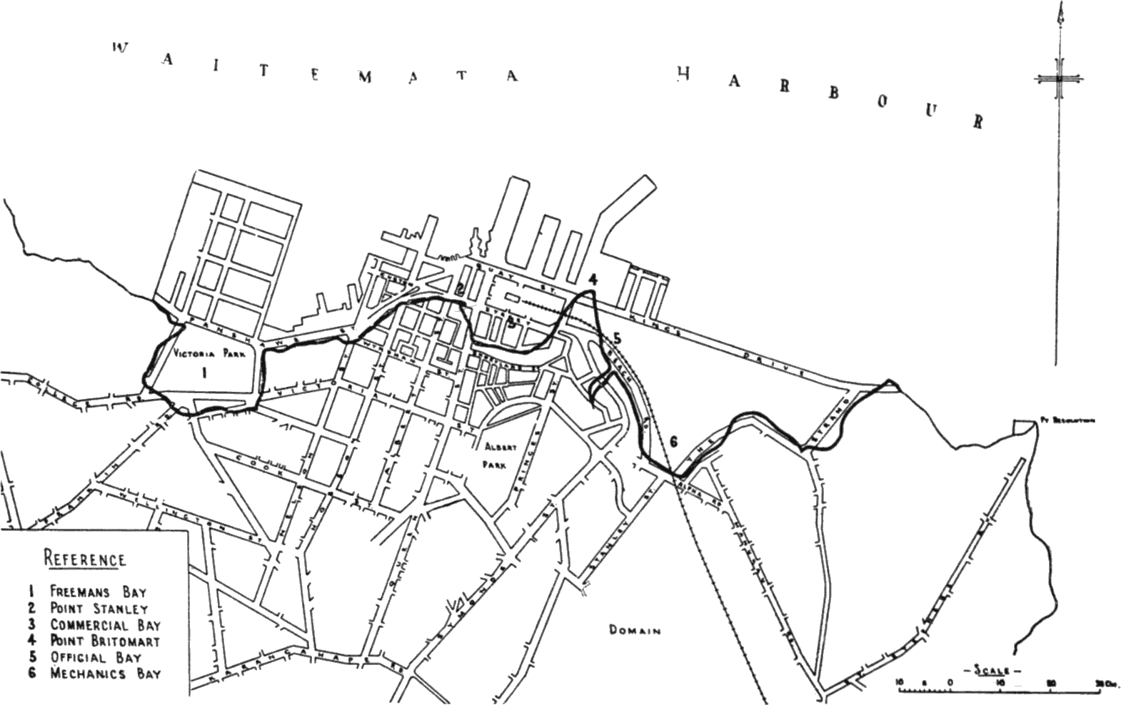 [21] Albert Barracks occupied the area bounded by Kitchener Street as far as Victoria Street, then followed an irregular line to Symonds Street at the point where Grafton Road now intersects, thence along Symonds Street to O’Rorke Street, and back on a line bordering Wellesley Street to the starting point at Kitchener Street. In 1871 the Barracks were transferred from the Government to the City Corporation.