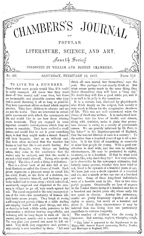 It is a curious fact, disclosed by physiologists who think deeply on the subject, that society is very much to blame for the comparative shortness of life. This was not well understood when the Dance of Death was written. It is understood now. Inquiries into the laws of health and disease, along with statistics, make it plain that premature decease is owing to a variety of preventable causes. We are gravely informed by Dr Farr, in his letter[1] to the Registrar-general of England, that the natural lifetime of man is a century! To die earlier than a hundred years of age is all a mistake. It is the fault of something or somebody or other that people die young. With a good constitution to start with, and due care in ordinary circumstances, life may be protracted to eighty, to ninety, or to a hundred. If that be what most people like, why don't they try? It is very certain, as is observable by the newspaper obituaries, that latterly many persons, whether they have tried or not, lived to be upwards of a hundred years of age. We have just seen a death reported at a hundred and six, and a month or two ago one at a hundred and ten. Some of these long-lived individuals were of a humble rank in life. One or two were parish paupers. Occasionally we hear of negroes in the United States dying at a hundred and ten or a hundred and twelve years old, whose early life was spent in slavery. Among the aristocracy, deaths are pretty frequently reported at about eighty or ninety, but rarely at a hundred and above it. From these circumstances it may be inferred that fine living does not particularly contribute to extreme longevity.