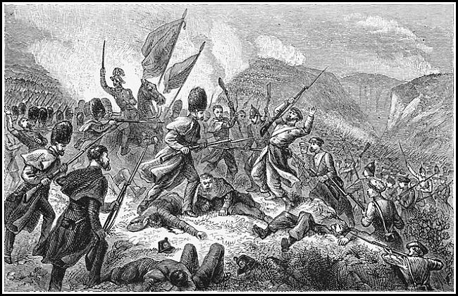 The introduction of long knives or bayonets, in 1672, which at first were made to fit or screw into the muzzles of the muskets to be used after the ammunition had been exhausted, soon became a great favourite with our men. In the early part of the 17th century regiments were reduced to 1000 men, exclusive of officers; and gunpowder, which heretofore had been carried in flasks, was made up into cartridges and carried in pouches, as now. In 1764 the infantry discontinued carrying the sword. Since then the arms of the infantry have been limited to the musket or rifle and bayonet. The arms and equipments of the British soldier have seldom differed materially from those of other European States. At times, however, through neglect, the arms of our soldiers have been inferior to those of nations against whom they have had to contend. Such was the case at Inkermann with our Fourth Division and Marines; but, notwithstanding this disadvantage, the superiority of the Briton came out in all its splendour.