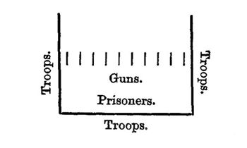 The line of battle of our Saxon forefathers was simple in the extreme. The Royal standard stood in the centre; around it gathered the mounted Thanes, while the infantry stood in the foremost ranks to bear the brunt of the fighting. The weapons carried by the infantry during several reigns succeeding the Conquest were bows and arrows, half-pikes, swords, and daggers. Armour was worn on the head and body, and in course of time the practice became general, and men were so completely encased in steel that it was almost impossible to slay them. But the introduction of gunpowder for purposes of war, in the early part of the fourteenth century, produced a change in the arms of both mounted and dismounted soldiers. Bows and arrows gave place to various kinds of fire-arms, but the British archers continued formidable gentlemen to face. We find that, during the reign of Queen Elizabeth, companies of infantry numbered from 150 to 300 men.[xi] Each company had a colour, and were armed in five different ways. A company formed up for attack, or defence, would appear thus:—
