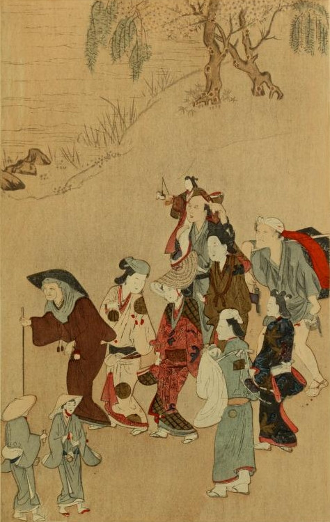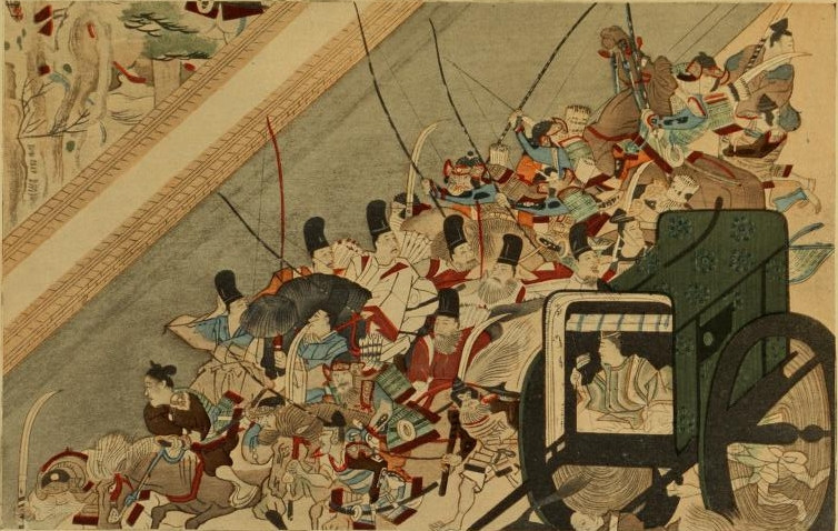 Par toutes les avenues affluaient les visiteurs, venant rendre leurs devoirs à la princesse, les seigneurs à cheval, les femmes nobles dans des chars traînés par des bœufs, ou dans des norimonos. La cour sortait des palais, se réunissait sur les terrasses. Fiaki se hâta de descendre.