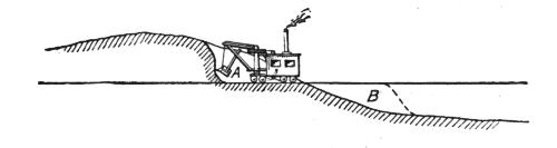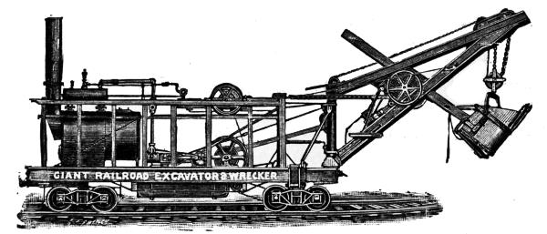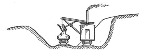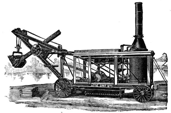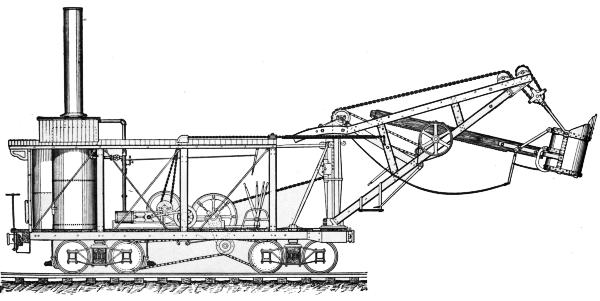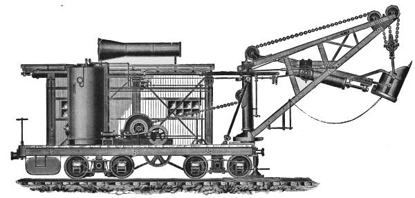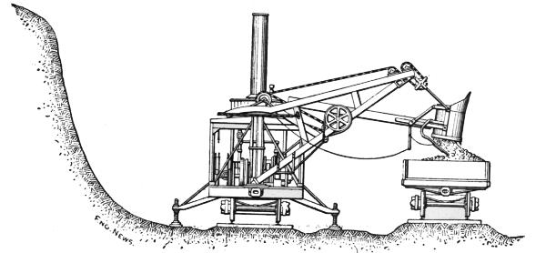 The steam shovel, or steam excavator, is a modified form of dredge adapted for excavating material on dry land. It was designed and patented by a Mr. Otis, about 1840, and like most new inventions the first machine built was a very clumsy affair,[3] but even in this crude state it possessed many advantages for removing large masses of material. Its merits were recognized in its earliest stages, and with increased experience in its operation improvements were soon made which rendered it almost indispensable on all works requiring large quantities of excavation.