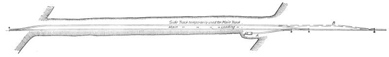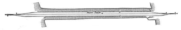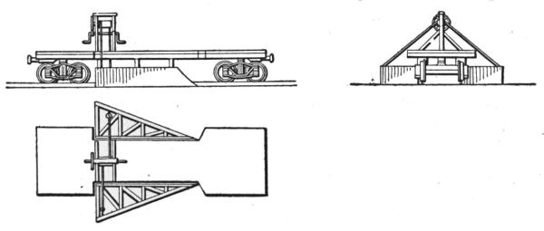 The first machines built were of the second type. As now constructed they are mounted on a wide wooden frame or car body, supported by four small wheels of 7 ft. to 8 ft. gage, thus placing the machinery close to the ground, with a wide base of support. In transporting this machine from one place to another, not on the line of a railway, it is necessary to take it apart, forward the sections and put them together again at the site of the new work. The machine is built with a view to rapid dismantling and re-erection, and for work requiring a large machine for economical excavation, located in hilly country not yet made accessible by rail, or requiring transportation by boat, it is the machine most generally used. Its ready adaptability to all kinds of work in any location has made it the favorite machine with many general contractors whose work includes large contracts for railway and other excavation. For transportation by rail this machine is run onto an ordinary flat car, only the crane being detached and loaded on a separate car. With this manner of shipment the machine can be made ready for railway work very quickly, but for exclusive railway work[5] a machine of a later design has come into use and is now generally preferred for this class of work.