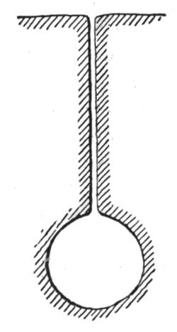 For soft, tenacious material, likely to adhere to the inner sides of the dipper, and not drop out promptly when the bottom door[12] is opened for unloading, the dipper is shaped as shown in Fig. 10, with a larger bottom than mouth. In hard, or dry soft material the section shows parallel sides, as in Fig. 11. For general use the bottom of the dipper should be slightly larger than the mouth, as most materials contain more or less moisture which is likely to produce a partial clogging of the dipper by material sticking to the inner sides, especially between the teeth, necessitating frequent cleaning out whenever the machine is stopped while preparing to move forward, and sometimes oftener. For ordinary clay, cemented gravel, and hard dry materials, a dipper with a wide and shallow mouth, as shown in plan in Fig. 12, is preferred to the one shown in Fig. 13, which latter is better adapted for loose gravel, sand and other soft dry materials where a deep cut can easily be made. For hardpan, shale, loose rock and similar materials, ample strength of teeth and dipper is of greater importance than its shape.