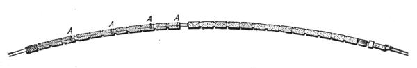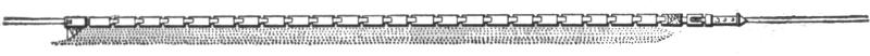 The chains have links of three-quarters-inch to one-inch diameter, and are made of iron, sometimes of steel. Their constant use necessarily subjects them to great wear, and as they are also often exposed to severe shocks (especially the hoisting chain) they must be made of the very best material and in the most careful manner. At present iron chains are preferred to those made of steel: they are more durable, and less likely to break under severe shocks. Steel chains have suffered in reputation through rapid wear and frequent breakages occurring within the last few years, but with increased experience in their manufacture and use they will undoubtedly be improved, and eventually take the lead over iron chains.
