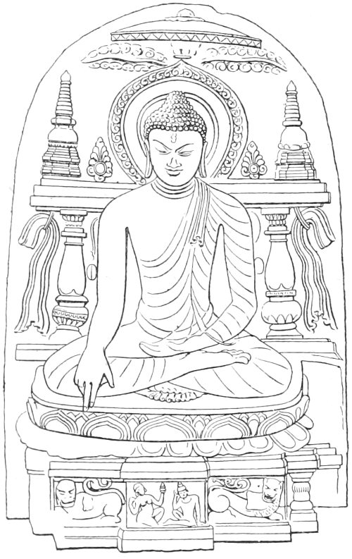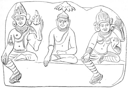 The portrait which faces page 74 is well worthy of attention as illustrating the connexion[2] between Buddhism xiv and Brāhmanism. It is from a recently-taken photograph of Mr. Gaurī-Ṡaṅkar Uday-Ṡaṅkar, C.S.I.—a well-known and distinguished Brāhman of Bhaunagar—who (with Mr. Percival) administered the State during the minority of the present enlightened Mahā-rāja. Like the Buddha of old, he has renounced the world—that is, he has become a Sannyāsī, and is chiefly engaged in meditation. He has consequently dropped the title C.S.I., and taken the religious title—Svāmī Ṡrī Saććidānanda-Sarasvatī. His son, Mr. Vijay-Ṡaṅkar Gaurī-Ṡaṅkar, kindly sent me the photograph, and with his permission I have had it engraved.