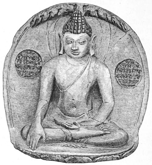 He is seated on the Mućalinda Serpent (see p. 480), in an attitude of profound meditation, with eyes half closed, and five rays of light emerging from the crown of his head. [Frontispiece.