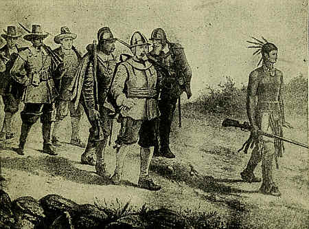 A friendly young Indian named Hobomok came to live with the Pilgrims. As he knew all about the Indians and the country, he was of great help to them. (1340. Miles Standish and His Soldiers.) Here you see Captain Standish and some of his soldiers following the faithful Hobomok, who is showing them the way.