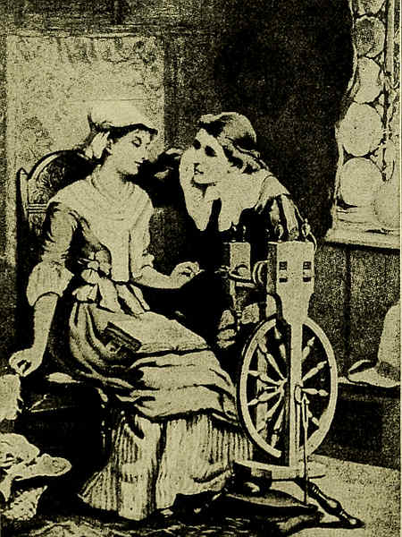 (3298. Priscilla Spinning. Barse.) In this picture we see a Puritan maiden sitting near the cozy[30] fireplace, spinning with a spinning wheel which she runs with her foot. She has her Bible in her lap, probably so that she may once in a while read a verse or two to be thinking about as she works.