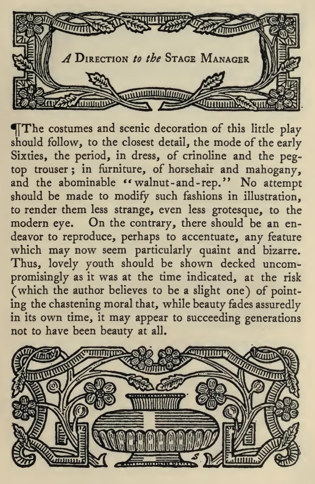 The costumes and scenic decoration of this little play-should follow, to the closest detail, the mode of the early Sixties, the period, in dress, of crinoline and the peg-top trouser; in furniture, of horsehair and mahogany, and the abominable "walnut -and -rep." No attempt should be made to modify such fashions in illustration, to render them less strange, even less grotesque, to the modern eye. On the contrary, there should be an endeavor to reproduce, perhaps to accentuate, any feature which may now seem particularly quaint and bizarre. Thus, lovely youth should be shown decked uncompromisingly as it was at the time indicated, at the risk (which the author believes to be a slight one) of pointing the chastening moral that, while beauty fades assuredly in its own time, it may appear to succeeding generations not to have been beauty at all.
