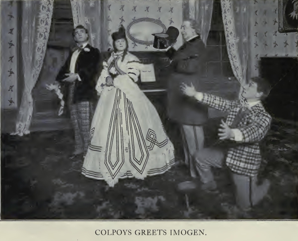 [During the rest of the act, he is continually in difficulties, through his efforts to wear one of the gloves upon his right hand. Mrs. Mossop now re-enters, with Imogen Parrott. Imogen is a pretty, lighthearted young woman, of about seven-and-twenty, daintily dressed.]