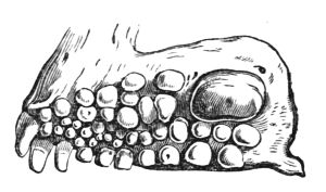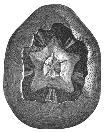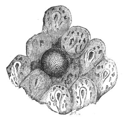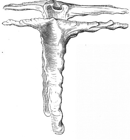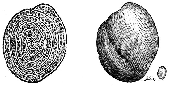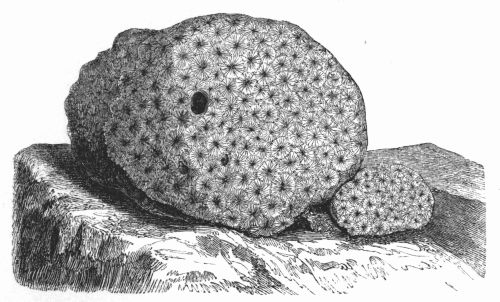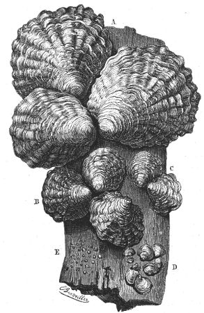 [9] We give this illustration as representing the comparative size of the oysters at different ages; but it is necessary to state that the specimens were artificially attached to the block by means of glue for exhibition. Oysters always attach themselves by the back of the rounded shell near to the hinge, as stated at p. 363.