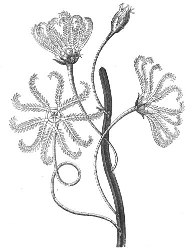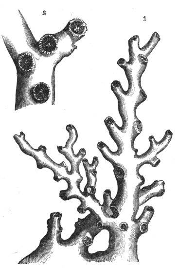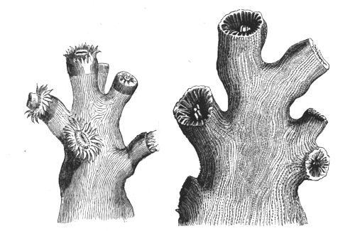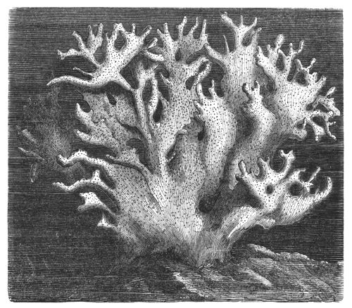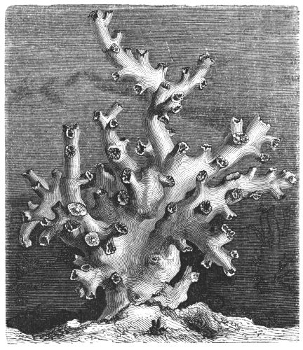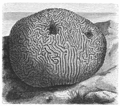 The learned Schleiden eloquently paints the living wonders of the deep: "If we dive into the liquid crystal of the Indian Ocean, the most wondrous enchantments are opened to us, reminding us of the fairy tales of childhood's dreams. The strangely-branching thickets bear living flowers. Dense masses of Meandrineas and Astreas contrast with the leafy, cup-shaped expansions of the Explanarias, and the variously-branching Madrepores, now spread out like fingers, now rising in trunk-like branches, and now displaying an elegant array of interlacing tracery. The colouring surpasses everything; vivid greens alternate with brown and yellow; rich tints, ranging from purple and[vi] deepest blue to a pale reddish-brown. Brilliant rose, yellow, or peach-coloured Nullipores overgrow the decaying masses: they themselves being interwoven with the pearl-coloured plates of the Retipores, rivalling the most delicate ivory carvings. Close by wave the yellow and lilac Sea-fans (Gorgonia), perforated like delicate trellis-work. The bright sand of the bottom is covered with a thousand strange forms of sea-urchins and star-fishes. The leaf-like Flustræ and Escharæ adhere like mosses and lichens to the branches of coral—the yellow, green, and purple-striped limpets clinging to their trunks. The sea-anemones expand their crowns of tentacula upon the rugged rocks or on flat sands, looking like beds of variegated ranunculuses, or sparkling like gigantic cactus blossoms, shining with brightest colours.
