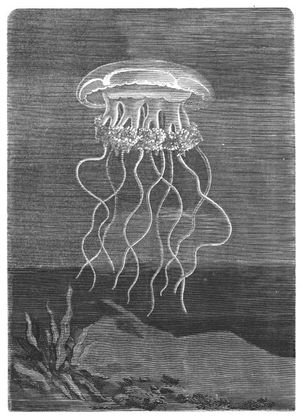 "Around the branches of the coral shrubs play the humming-birds of the ocean: little fishes sparkling with red or blue metallic glitter, or gleaming in golden green or brightest silvery lustre; like spirits of the deep, the delicate milk-white jelly-fishes float softly through the charmed world. Here gleam the violet and gold-green Isabelle, and the flaming yellow, black, and vermilion-striped Coquette, as they chase their prey; there the band-fish shoots snake-like through the thicket, resembling a silvery ribbon glittering with rose and azure hue. Then come the fabulous cuttle-fishes, in all the diaphanous colours of the rainbow, but with no definite outline.
