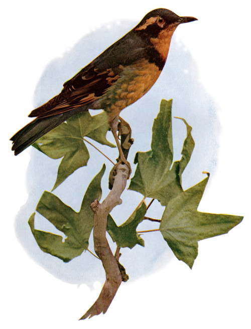 The Varied Thrush is one of the most beautiful members of the family of thrushes. Its range is somewhat limited as it frequents only the coastal regions of the northwestern part of North America. In winter, however, it may be found in California and is occasionally seen as far south as Lower California. As a straggler, it is sometimes noticed in the New England states.