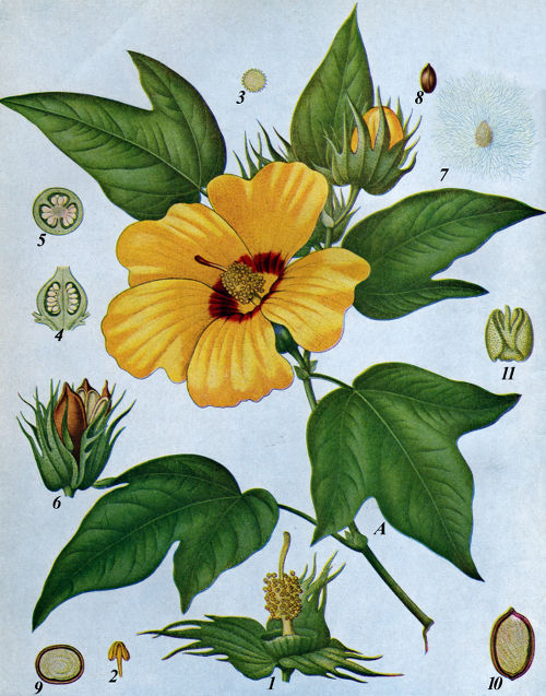 There are a number of cotton yielding plants which belong to the genus Gossypium of the Mallow family (Malvaceæ), the same family to which the Hibiscus and garden mallows belong. The most important species are G. barbadense, which yields the noted Sea Island cotton, and G. herbaceum. Both are extensively cultivated in the United States, the latter species more than the former. Other more or less cultivated species are G. arboreum, G. religiosum and G. punctatum. The cottons are handsome plants with large, showy yellow or purple flowers. They vary from comparatively small and herbaceous to shrubby or even approaching the dimensions of trees. The seeds are borne in a three to five lobed capsule, which ruptures at maturity, thus allowing the snow-white cotton head to appear. The outer surface of the seeds is covered with slender fibers, each fiber being simply a single, greatly elongated epidermal cell. The individual fiber is flattened, twisted upon its axis, flexuous, from one to two or three inches in length. These fibers constitute the cotton of the market, which finds so many important uses in human economy. Of course primarily nature intended these fibers for the special use of the plant itself; being a means of aiding in the distribution of the seeds, and no doubt also serving as a protection against being eaten by animals, as the dense, more or less intertwined growth of insipid, tenacious fibers constitute anything but a tempting morsel. Man, by his ingenuity and skill, has been enabled to utilize this product of nature in his own behalf.