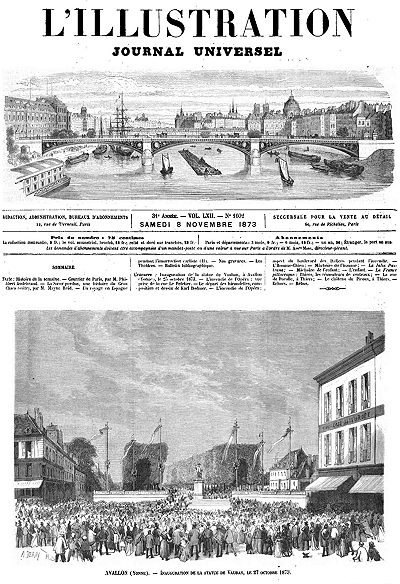 Gravures: Inauguration de la statue de Vauban, à Avallon (Yonne), le 25 octobre 1873.--L'incendie de l'Opéra: vue prise de la rue Le Peletier.--Le départ des hirondelles, composition et dessin de Karl Bodmer.--L'incendie de l'Opéra: aspect du boulevard des Italiens pendant l'incendie.--L'Homme-Chien;--Mâchoire de l'homme;--La Julia Pastrana;--Mâchoire de l'enfant;--L'enfant.--La France pittoresque: Thiers, les rémouleurs de couteaux;--La rue de Durolle, à Thiers;--Le château du Piroux, à Thiers.--Rébus.