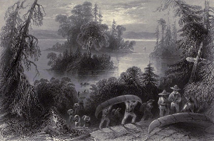 Canoes, another fabric which the Indians construct very rudely, are yet adapted with considerable skill to their purpose. These are usually framed of the bark of a single tree, strengthened at the centre with ribs of tough wood. The ends are of bark only; but being curved upwards, are always above water, and thus remain perfectly tight. Our sailors can scarcely believe such nut-shells safe even on the smoothest waters, and see with surprise the natives guiding them amid stormy waves, when their very lightness and buoyancy preserve them from sinking. They have another quality of great advantage in the devious pursuits of the owners; being so extremely light, that they can be easily conveyed on the shoulder from one river or branch of a lake to another. One man, it is said, can carry on his back a canoe in which twelve persons can navigate with safety.