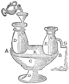 Let A, B, C, D, be the foot, at each end whereof, place a vessell equall in bignesse, the one to the other; as D, E; also let there passe a hollow cane from the one to the other, as A, R, A, the ends whereof must almost touch the tops of the sayde vessels; in the vessell D, there must bee a hollow pipe, as F, whereby you may by help of a tunnel powr water into the vessell: also in the vessell E, there must be a crane, as G; now if you fill the vessel E with wine almost unto the top of the crane, and afterwards stoppe the mouth of the vessell, that the ayre may not breath foorth, it will not run of it selfe: but if you put water into the vessell D, the ayre contayned in it, will passe through the hollow pipe, A, R, A, into the vessel E, where striving for a greater quantity of roome, it presseth the wine out of the vessell E, (by the crane) answerable in quantity unto the water powred into the vessell D.