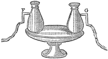 Let there bee 2 vessels placed upon one foot, having a hollow cane passing from one to the other (as I taught in the precedent probleme) but let there bee 2 cranes as F, G, one in each vessell; then fill one of the vessels with wine, but not above the crane, so it will not runne of it selfe: but if you powre water into the other vessell, untill it bee full, it will cause that wine shall runne out of the one, and cleare water out of the other.
