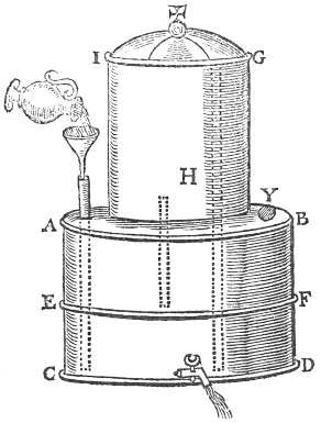 Let A, B, C, D, bee a vessell having a partition in the middle, as E, F, let there be placed upon this vessell, a Cylinder of Glasse cleare, and very transparant, that will contayne the same quantity of water, that one of the partitions will, as I, G, H; in the lowermost partition towards the bottome, let there bee a cocke, and out of the same vessell let two pipes be made to passe, the one wherof reacheth almost unto the top of the Cylinder, the other must come out by the side of the Cylinder: also out of the upper partition there must come another pipe. Moreover there must be a hole, through the top of the uppermost partition as Y. Fill the lower partition at the pipe, also the upper partition by the hole Y: note then that if you turn the cocke as the water runneth out of the lower partition, the water contained in the upper partition wil ascend throgh the pipe into the glasse Cylinder. When all the water in the lower partition is runne out at the cocke, then the water which before did ascend into the Cylinder, will fall backe againe into the upper partition: after this manner may you compose an artificiall water clocke, if you note the howres upon the Cylinder, and make the cocke after such manner, as that the water may issue out but by droppes.
