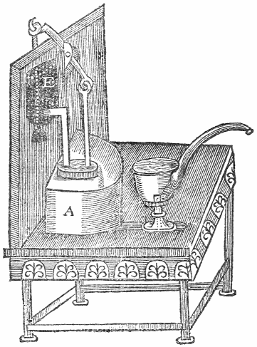 Svppose A to bee a vessell full of water, having a pipe comming from the bottome, and rising up into a cup of the just height that the vessell is of; over the vessell fild with water, let there be placed another vessel, as E. From this vessell must come a pipe, and reach with in the other vessell. Now ouer this vessell there hangeth, as it were, the beame of a scale; at the one ende whereof, is fastened a peece of boord, hauing a leather nayled upon the top; at the other end of this beame must hang a weight, but not full so heauie as the peece of boord lethered is. Fill both these vessells with water, and the cup also; note then, that if you sucke out the water in the cup by the pipe on the side of it, the water in the vessell will come into it, untill it is in both of equall height: now as the water falleth downe in A, the peece of boord that is hanged unto one end of the beame falleth after it (because it is heauier then the weight) and so giueth way unto the water in E, which runneth into it; and when the vessell is filled againe with water, it beareth up the sayd peece of boord against the pipe of the vessell E, so that the water can run out thereat no longer, except the water bee againe drawne out of the cup.