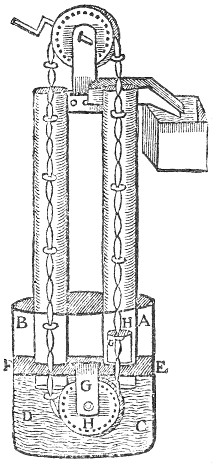 Svppose A B C D to be a deepe Well, and E F to be a strong peece of timber fastned athwart the same, a good way in the water. In this planke let there bee fastened a peece of timber with a strong wheele in it, as G H, hauing strong yron spikes droue athwart the wheele within the creuise, and strongly riueted on each side: let them be three or foure inches distant from each other. Let there bee likewise made in the sayde planke two holes, in which set two hollow posts, that may reach to the top of the Well, or so much higher as you desire to mount the water; let them bee made fast that they stirre not. In the bottom of one of these posts, there must be fastned a barrell of brasse, as G H, made very smooth within, and betwixt those two posts at the top; let there bee fastned unto them both another peece of strong timber to hold them fast, lest they start asunder; and in the midst of that make a mortice, and in it fasten a strong peece of timber with a wheele like to the former mentioned; the pin whereof ought to bee made fast unto the wheele, and haue a crooked handle to turne about, that by turning of it, you may turne the wheele also. Then prouide a strong yron chayne of length sufficient, hauing on euery third or fourth linke a peece of horne, that will easily goe through the brasse barrell, and a leather of each side of it, but somewhat broader then the horne; put this chayne under the lower wheele in the Well upon both the hollow posts, draw it ouer the upper wheele, and linke it fast and straight. Turn then the handle round, and it will turne the chayne round, whose leathers comming up the brasse barrell, will beare the water before them; this goeth very strongly, and therefore had neede bee made with wheeles and wrought upon by horses, for so the water is wrought up at Broken Wharfe in London.