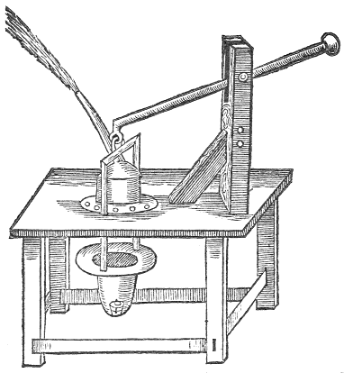 Let there be two hollow posts, with a succur at the bottom of each, also a succur nigh the top of each: let there be fastned unto both these posts a strong peece of timber, having, as it were, a beame or scale pinned in it, and having two handles, at each end one. In the tops of both these hollow posts fasten two brasse barrels, made very even and smooth within, unto these two barrels let there be fitted two forcers, lethered according to art, at the tops of these forcers must be fastned two yrons, which must bee linked unto the aforesaid beam; from each post below towards the end of the barrels, let there bee two leaden pipes, which afterward meet in one, to conduct the water up to the place desired, which if it bee very high, there will be need of some succurs to catch the water as it cometh.
