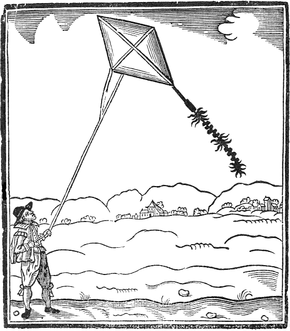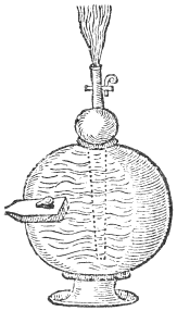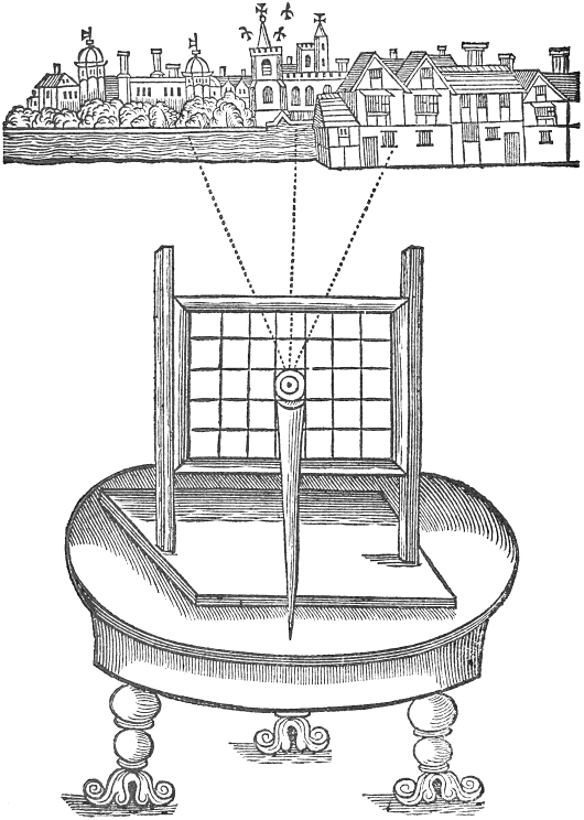 First prepare a round peece of wood, hauing a brasse box in the midst, such as they make to hang the mariners compasse with, but a good deale bigger, round about this peece of wood fasten divers shreds of thin lattin, standing obliquely or ascew, as the figure doth represent; round about these fasten a coffin of thin pastbord, cut into seuerall formes of fishes, birds, beasts, or what you please. Prepare a lantern with oyled parchment, sufficient to conteine it, in the midst of whose bottom must bee erected a spindle with a narrow point, to hang the pastbord cut into formes upon: upon each side let there be a socket for to set a candle in, also let there bee made a doore in the bottom to put the candles in at, and after to be shut, and it is done. If you set two candles in the sockets, the heat of them will turne the whole pastbord of formes round.