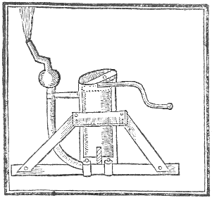 Let there be a brasse barrell provided, having two succurs in the bottom of it: let it also have a good large pipe going up one side of it with a succur nigh unto the top of it, and above the succur a hollow round ball, having a pipe at the top of it made to screw another pipe upon it, to direct the water to any place. Then fit a forcer unto the barrell with a handle fastned unto the top; at the upper end of this forcer drive a strong screw, and at the lower end a screw nut, at the bottom of the barrell fasten a screw, and at the barre that goeth crosse the top of the barrell, let there be another screw nut: put them all in order, and fasten the whole to a good strong frame, that it may stand steddy, and it is done. When you use it, either place it in the water, or over a kennell, and drive the water up to it, and by moving the handle to and fro, it will cast the water with mighty force up to any place you direct it.
