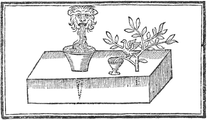 Let there be a cestern of lead or such like, having a tunnell on the top: let it bee placed under the fall of a Conduit, and at the one end of the top, let there come out of the vessell a small pipe, which let bee bent into a cup of water, and there will be heard a strange voice. Over this pipe you may make an artificiall tree with diuers birds made to sit therein.