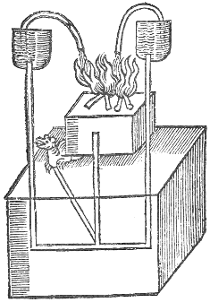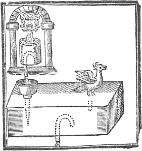Prepare a cestern having an altar of brasse or tin upon it, let there be in the cestern a hollow pipe turning up out of the cestern at each end; also in the middle within the altar, also on the side of the altar into the body of a dragon artificially made, with a reed in the mouth of it. Let there bee two boxes at the tops of the pipes, on the ends of the cestern, having two crooked pipes or cranes comming out of them. Fill the boxes with water when you occupy it, also put fire upon the altar, and the dragon will hisse, and the water in the two boxes being wrought upon by the heat of the fire comming thorow the pipes, will drop into the fire. These two boxes ought to be inclosed in the bodies of two images, and the two short cranes comming out of them in her armes and hands.