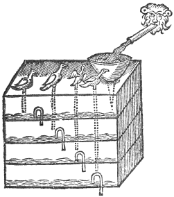 Prepare a cestern having divers partitions, one above another; let them all have cranes in the bottoms to carry the water from one to another; also let each cestern have his severall pipe, all of them coming out at the top of the cestern, on whose tops let birds bee artificially made, with reeds in them: also in the top of the upper cestern let there bee a tunnell. Place it under the fall of a conduit of water, and you shall heare so many severall voyces as there are birds.