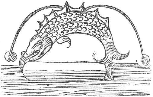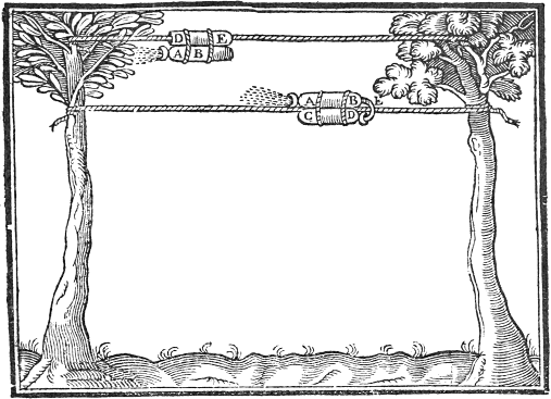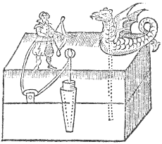 Let there be a cestern having a partition in the midst, in the partition let there bee a deep succur, having a small rope fastned unto the top of it: let the one end of the rope come out of the upper lid of the cestern, and bee fastned unto a ball, the other part thereof let it be put under a pulley (fastned in the partition) and let it be carried also out of the upper cestern, and be fastned unto the arme of the image, which must bee made to slip to and againe, and to take hold of the string of a steele bow that is held in the other hand. At the other end of the cestern let there bee made an artificiall image of a Dragon, through whose body must come a small pipe with a reed artificially fastned in the upper part thereof. Note then, that when you put up the ball, the image will draw his bow, and when you let it fall, the Dragon will hisse.